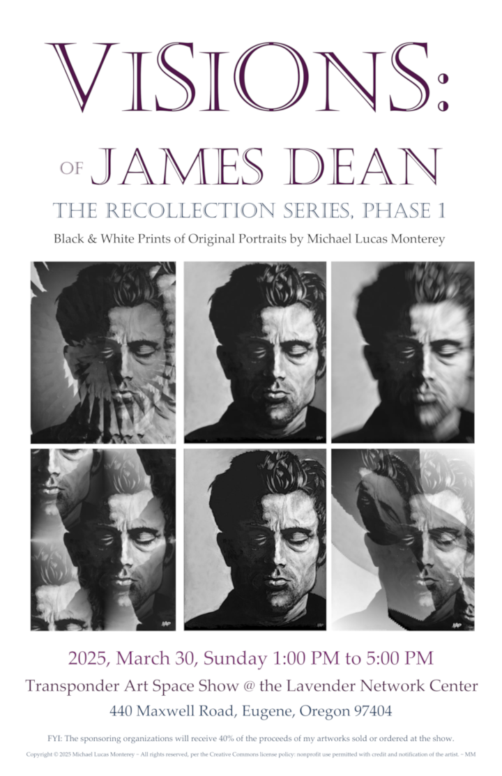 NOTE: If you think my initial prices are high, recall that old open edition prints of Hollywood stock photos of Dean sell for nearly $100 or more, unsigned. So, prices are subject to change. My next series will feature prints of my other portraits of famous celebrities and culture heroes. As time and resources permit, I will also issue colorful prints of my geometric-mathematical “maps” of the virtually mystical realm of Primal Numbers (amazing patterns and forms) enabled by the supra-natural logic of the cosmic field of Being. Other works may be more visionary/quasi-surrealist works. Still, all of my original artworks will be created or painted by me. All my original Works are products of my creative talents, inspirations, and skills, not creations of an artificial artist. When you buy my artwork, you get real art, not a cheap copy or “deep fake” created by a petty pirate or an “AI” app. So, thanks for caring. Sincerely ~ Michael